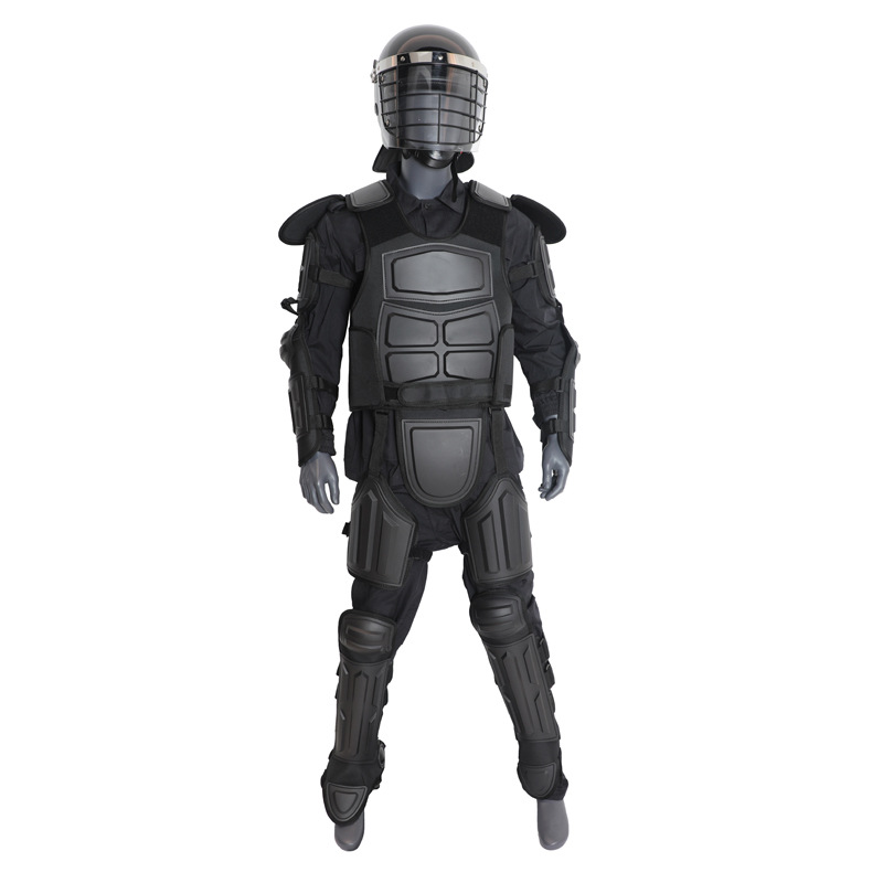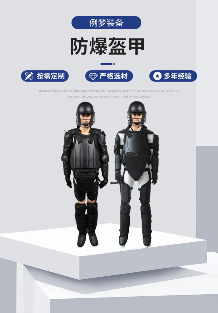 the structure comprise a chest protector, a crotch protector, a shoulder protector, a back protector, an arm protector, a forearm protector, a thigh protector and a shank protector, wherein that material composition is, from outside to inside, a rigid plastic shell, 600D flame retardant oxford cloth, shock-absorbing high-foaming EVA, plain cloth and breathable mesh cloth in sequence, and is suitable for a crowd with a height of 1.65m – 1.95m; and the protective performance is that the chest and the back can resist 120J kinetic energy impact and 20J anti-stab impact